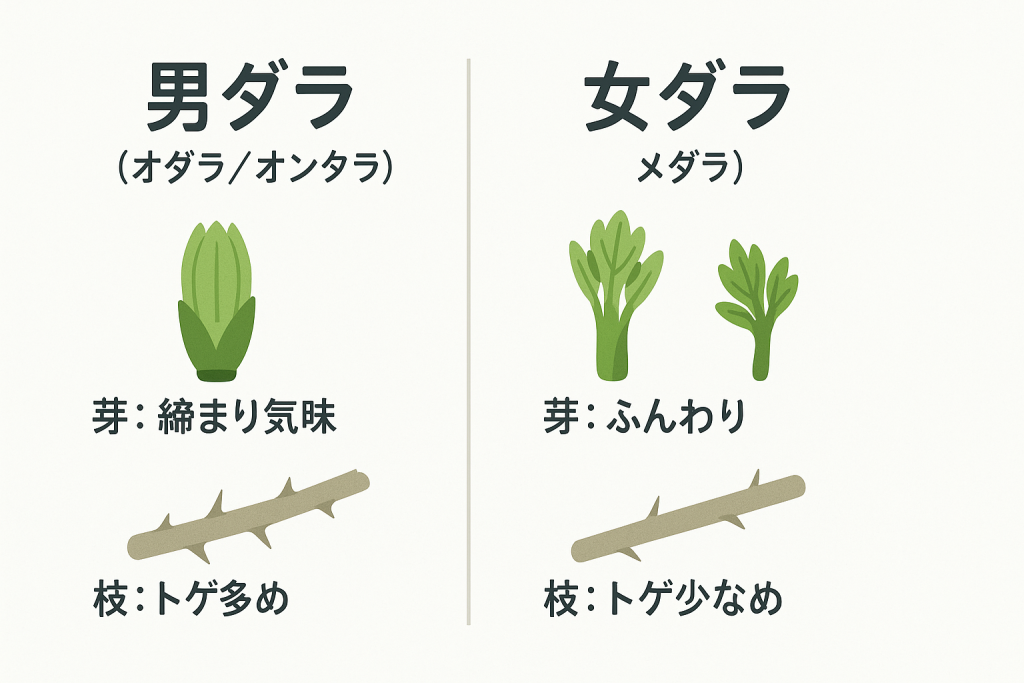 ここからが本題です。たらの芽には、実は雄株と雌株という2つのタイプがあるんです。同じたらの芽なのに、何が違うのか。その違いを知ると、選び方が変わってきます。